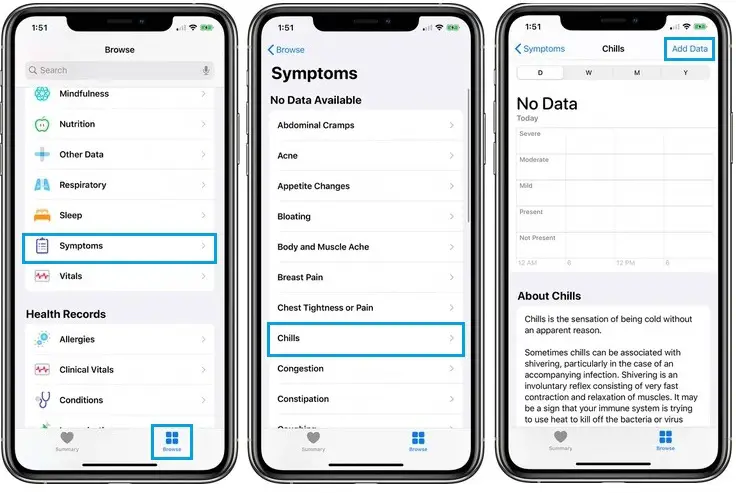 6. Tap on ‘Add Data’ (top-right corner of the screen) to log the symptom to the Health app.