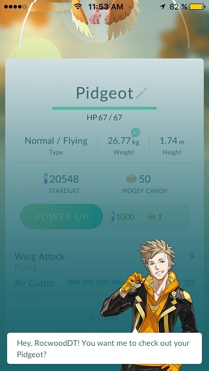 6. Select Appraise. Your Team Leader appears in the lower part of the screen. Tap the display to unveil the whole dialog, step by step and find out more about the Pokemon’s battle capabilities.