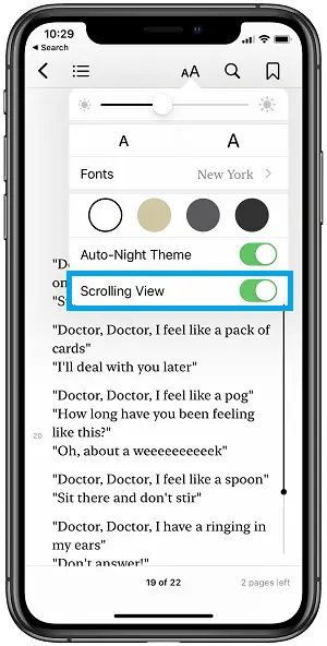 From the same menu you can turn on the Scrolling View option. This will convert the ebook to a one-page layout. You will reach new content by scrolling instead of tapping. Regular format pages are still counted so that you can keep track of your reading progress as you scroll.