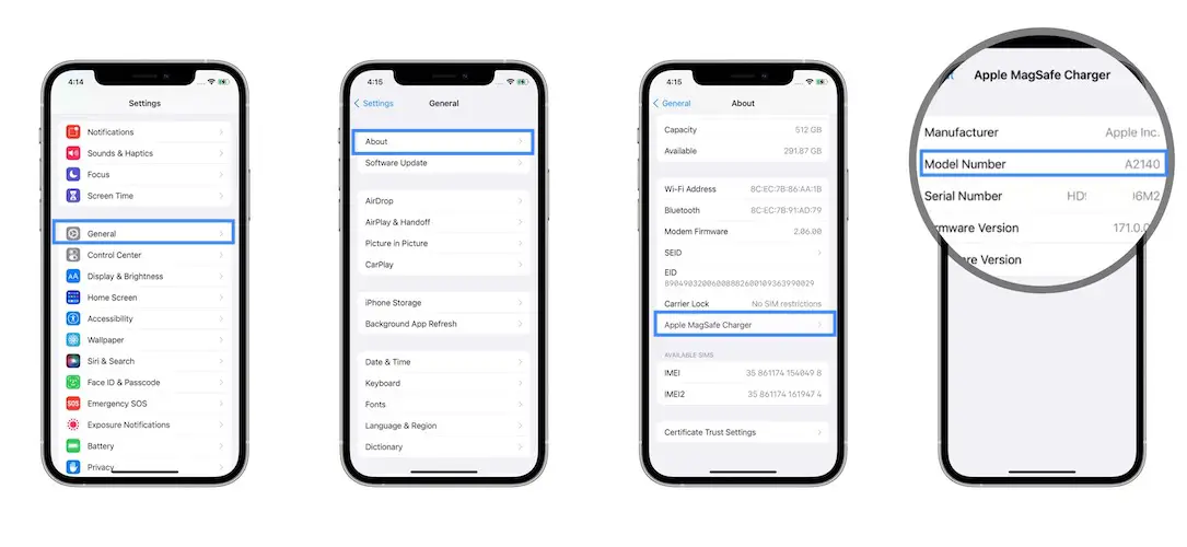 Fact: If the iPhone is charging and you can’t the Apple MagSafe Charger option in Settings it means that the accessory that your using is a counterfeit copy! - Review Model Number (A2140), Serial Number and Firmware Version.