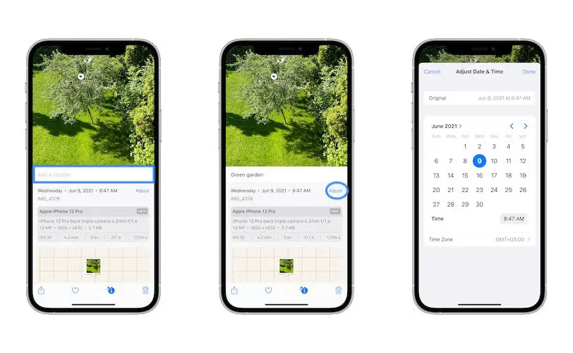 On the same interface, iOS 15 displays info about the picture capture date and time, which by the way, can be manually adjusted. The name of the image file as well as the Add a caption feature introduced back in iOS 14 are also available.