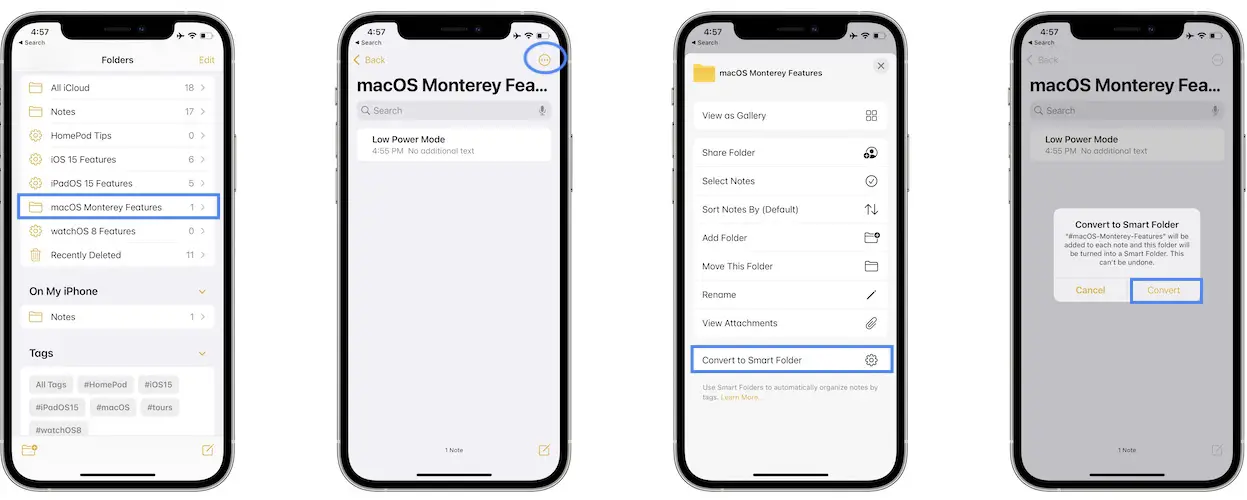 In the iOS 15 Notes app you can also create a Smart Folder from a regular Folder. To do this proceed as follows: