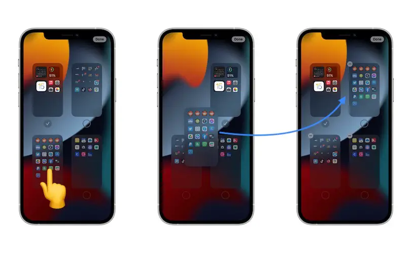 In iOS 15 you can also change the order of these pages. All that you have to do is long-press on a thumbnail and drag & drop it to the desired location, the same way you do with apps or widgets when you change their location on the Home Screen.