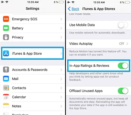 3. Deactivate the In-App Ratings & Reviews option by tapping the knob, available next to its label.