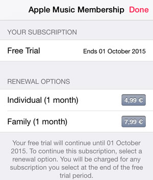 If you enjoy Apple Music and wish to continue to use the service, there is no other action required, once you initially subscribe to the service. The default setting charges your credit card link to your iTunes account, automatically, every month. As you might already know the fee is $9.99 for an individual membership, or $14.99 for a family plan, available up to 6 members.