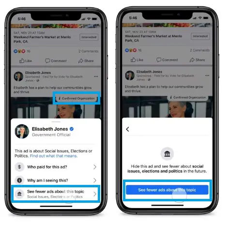 3. Confirm that you want to hide the ad and aim to see less ads about social issues, elections and politics.