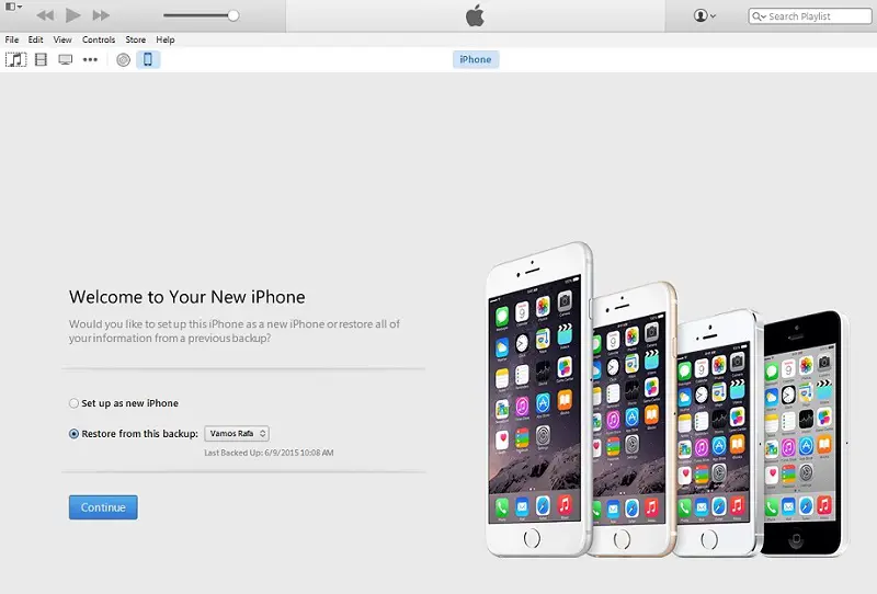 Step 7: After the iOS 8.3 install completes on your iPhone, iTunes asks you if you wish to set the iPhone up as a new device, or if you to restore all your info from a previously saved backup. The Restore from this backup option should be already selected. Click Continue and you’ll get your iPhone running iOS 8.3 back. The only thing that you have to re-configure are the TouchID fingerprints settings and your Ringtone setup.