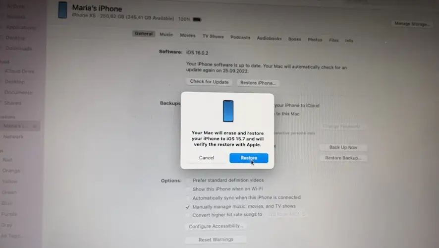 - 6. Select the recently downloaded iOS 15.7 ipsw file and click Open. Click Restore to confirm your selection when you’re prompted that iPhone will be erased and iOS 15.7 restored on your device.