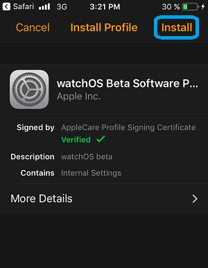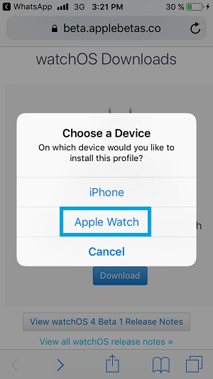 3. Tap on Apple Watch when prompted on which device you want to install the profile.