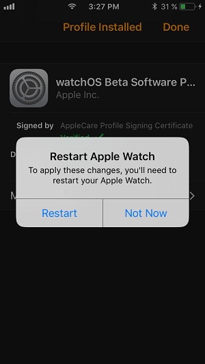 7. After the Apple Watch reboots, hit Done on the Profile Installed screen that displays on the paired iPhone.