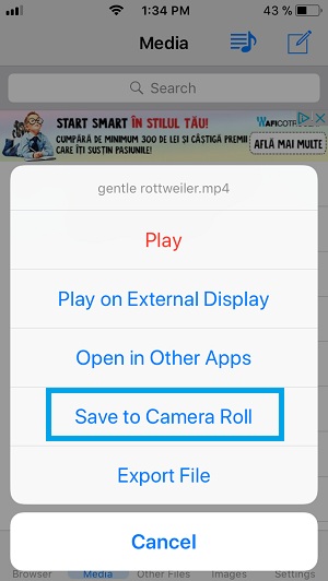 -> Tap the file’s name and select Save to Camera Roll from the options that slide-in.
