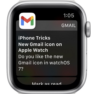Gmail doesn’t have a standalone app for the Apple Watch, but notifications are pushed to your watchOS device and the icon is displayed in the top-left corner of the alert screen.