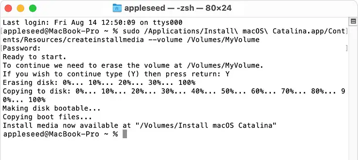 Tip: If Terminal alerts you that it wants to access files on a removable volume, Click OK to allow. - 8. When the process finishes the removable disk will be named Install macOS Big Sur. You can now quit the Terminal app and eject the external disk.