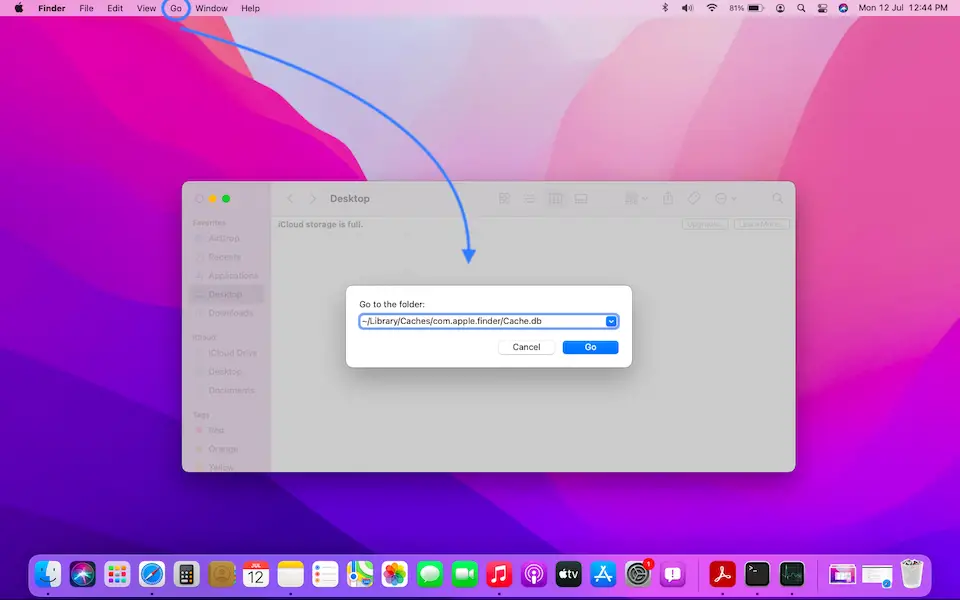~/Library/Caches/com.apple.finder/Cache.db - Click Go.