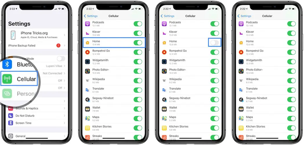 - A. Settings -> Cellular -> Search for Home in Cellular Data list and make sure that the permission to use mobile data is enabled!