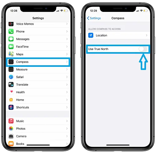 Compass didn’t work when ‘Use True North’ selected in Settings. Method 1 above (“Turn On Compass Calibration’) fixed it.