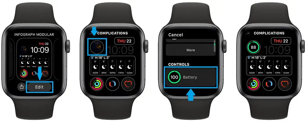 How To: Long-press on the Watch Face. Tap Edit and swipe for the Complications screen. Tap on the desired location and scroll for the Controls section. Tap on Battery. Click the Digital Crown twice to save your settings.