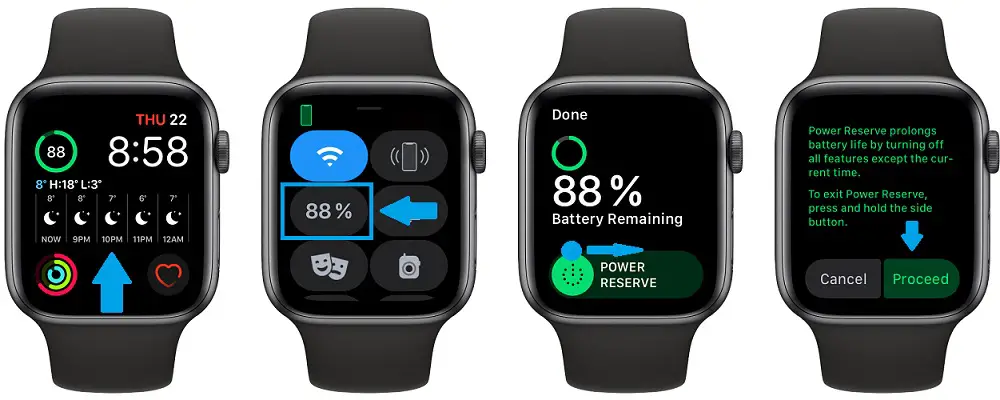 Important: Power Reserve can be exited if the Apple Watch battery percentage is above 10%, or if you connected the device to a charger!