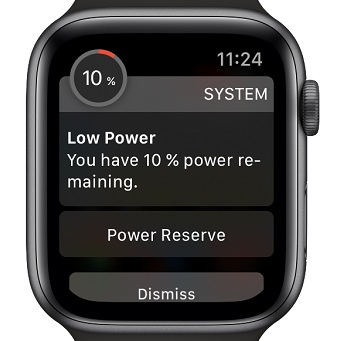 watchOS is configured to issue a Low Power alert when the remaining battery percentage on your Apple Watch drops below 10%. The notification provides you the option to enable Power Reserve. Power Reserve is an extreme Low Power Mode for your Apple Watch that keeps the current time as the only available feature.
