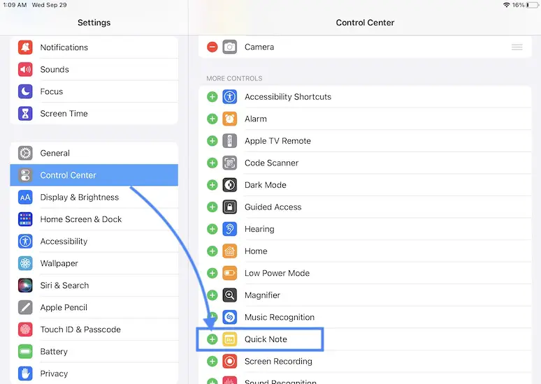 How to: Open Settings and browse for Control Center. In the More Controls list, tap on the green + icon, available next to Quick Note! Now, whenever the quick note gesture doesn’t work you can swipe for Control Center and use the button!