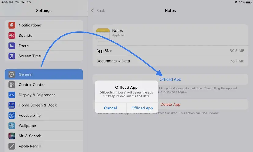 Next, you should delete Notes and install it back. In fact, I recommend you to offload the app to allow iPadOS 15 to automatically restore your documents and settings after you reinstall: