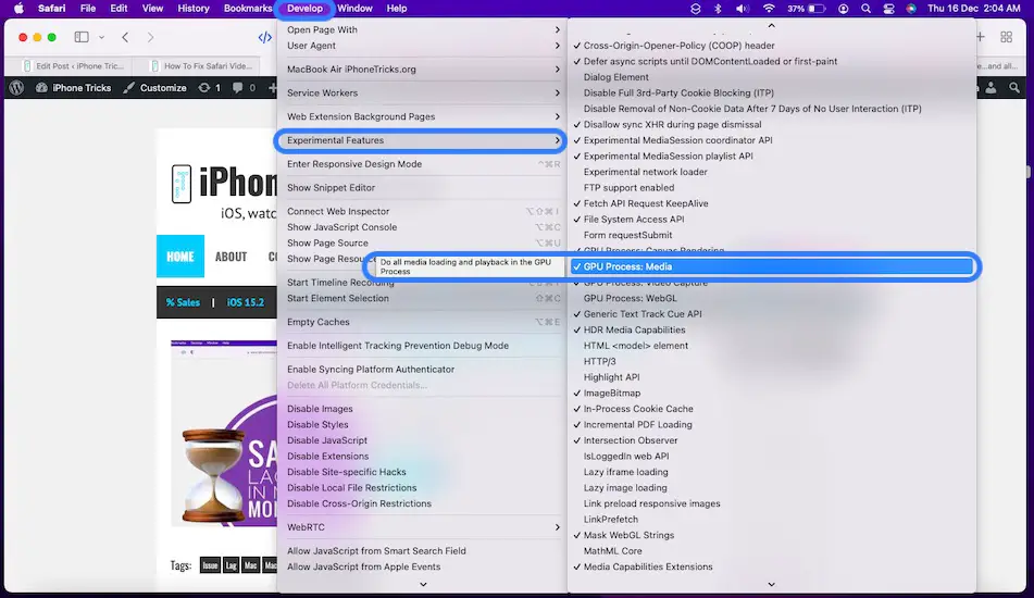 Since iOS 15.4 Apple has removed the GPU Process: Media option from the Safari – Experimental Features menu. This means that the above fix isn’t available anymore!