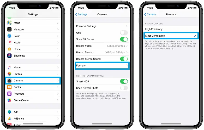 2. This fix is only available for new photos that you snap on your iPhone or iPad. Use the iOS Settings app to change the format used for capturing the photos from HEIF to Most Compatible.
