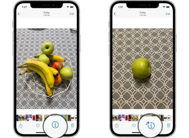 Fact: Check the screenshots provided nearby and notice how Visual Look Up is available for the apple photo, but doesn’t show up when multiple fruits are in the frame!