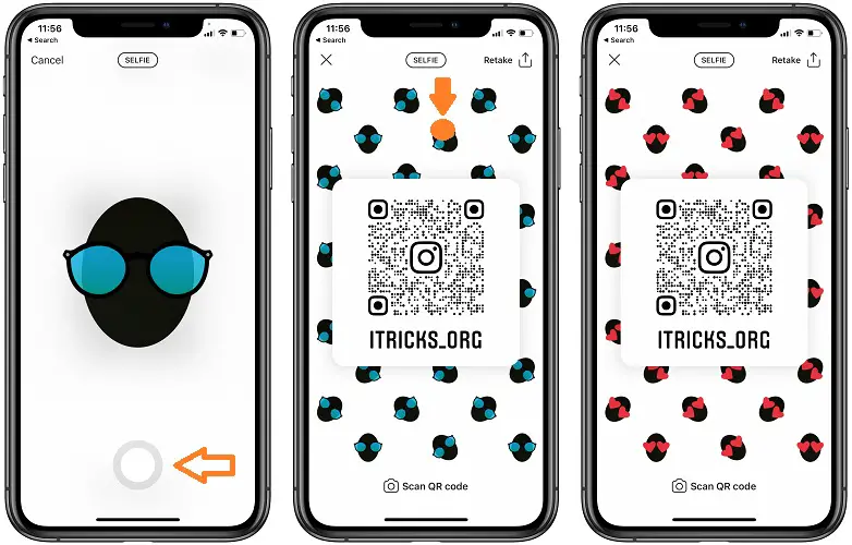 There is also a third option available when you plan to edit your Instagram QR Code. It’s the Selfie mode. Select it by tapping on ‘Emoji’, available in the top-middle area of the screen.