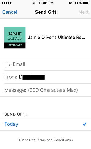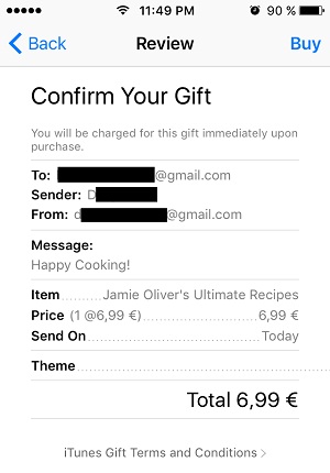Review your info one more time. The price of the app is displayed once again. You can also check the iTunes Gift Terms and Conditions. When everything is ready tap Buy in the top-right corner of the screen. Hit Buy Now to confirm once again and your gift is ready!