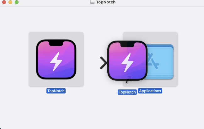 - 3. Drag & drop the TopNotch thumbnail on top of the Applications folder.