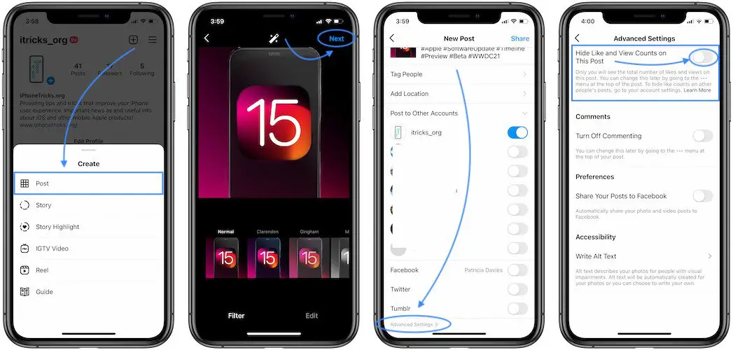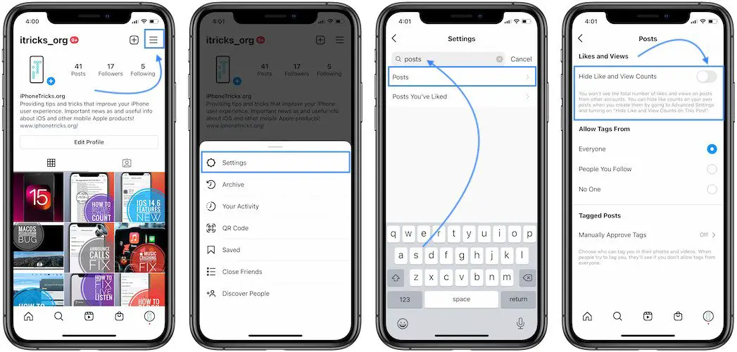 - Enable the Hide Like and View Counts feature and you won’t see the total number of likes and views on post from other accounts.