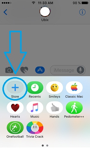 Step 5: The screen with all available iMessage apps is displayed. The first icon represents the App Store shortcut. It’s a “+” with the Store label beneath it. Tap it.
