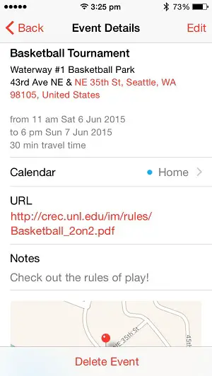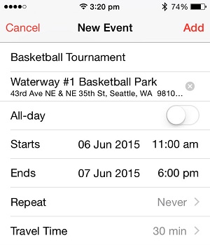 The first thing that you need to do is configure the new event. Let’s assume that you wish to play a basketball match with your friends. Open the Calendar app and tap on the red “+” icon in the top-right corner of the screen. Fill in the details of the event: Title, Location, Start & End Time, Travel Time, Event Type, Alert. If you plan to host an event in a public place, you can add the location’s website and additional notes, by tweaking the URL and Notes fields.