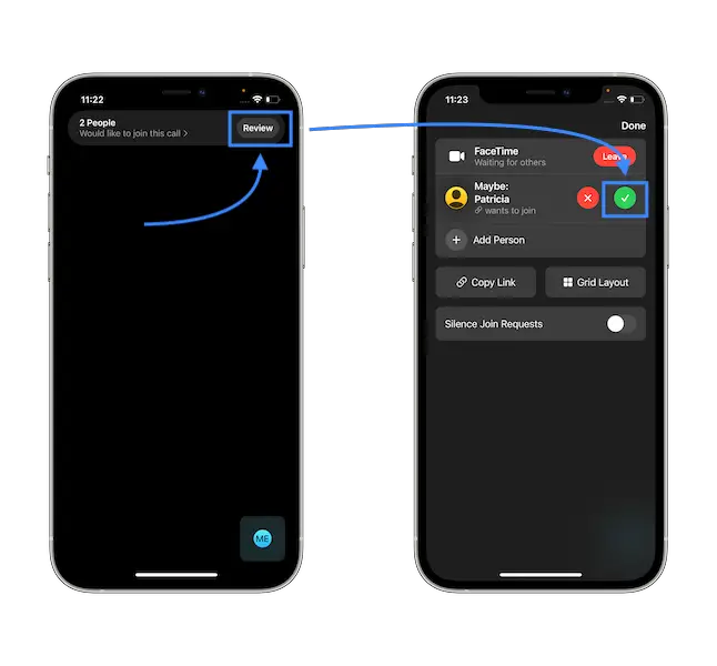 Important: Open the FaceTime conversation and be ready to accept the invitees requests for joining. Tap Review on the ‘X People Would like to join this call’ banner notification to check who wants to join. Tap the green OK sign next to each name to accept the participants.