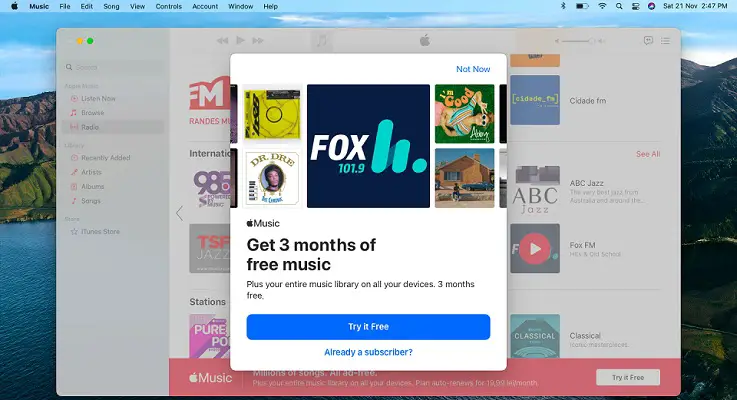 Unfortunately, this feature is currently not available on Mac. Attempting the same trick in macOS Big Sur brings up the prompt that asks you to subscribe to Apple Music.