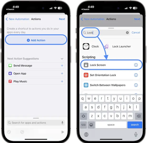 - 8. Go for Add Action, search for ‘Lock Screen’ and select it!