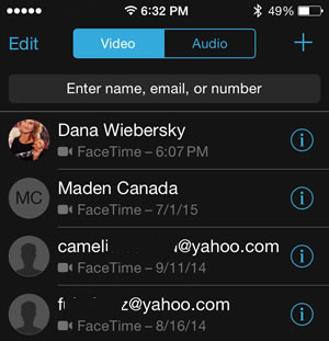 Step 2: Notice the video (camera) and audio (receiver) icons next to each result. If they’re active (lit), you can tap the desired form of communication and a specific FaceTime call will be initiated.