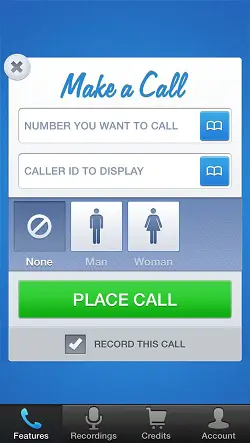 SpoofCard provides three hoax call features: Make a Call, Background Noise and Group Spoofing ! The first option allows you to change your voice from male to female or vice-vers and replace your caller ID with any number you wish. Background Noise maintains your original voice but adds a background so that it easily dissimulates your location and tricks your contact. You can choose various background sounds like: Airport, Dogs, Police, Traffic, Night Club, Casino, Crowd or Cell Noise.