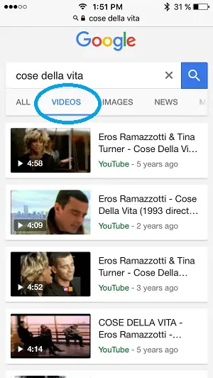 Tip: If the embedded video player isn’t automatically displayed in your search results, tab on Videos to bring up only Youtube hits!