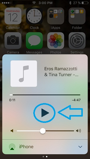 7. Swipe Up for the Control Center and hit the Play button available in the Now Playing field. If your iPhone runs iOS 10 or later, the Music controls are available on the second card. Swipe left on the iPhone controls menu to reach it.