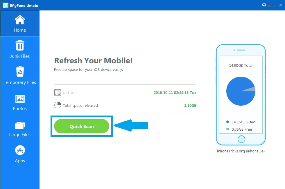 3. Scan iOS Device: – After your device is recognized, you’ll be informed about how much free space there’s currently available. Click the Quick Scan button to find out how much storage space can be freed out with the help of this iPhone cleaner.