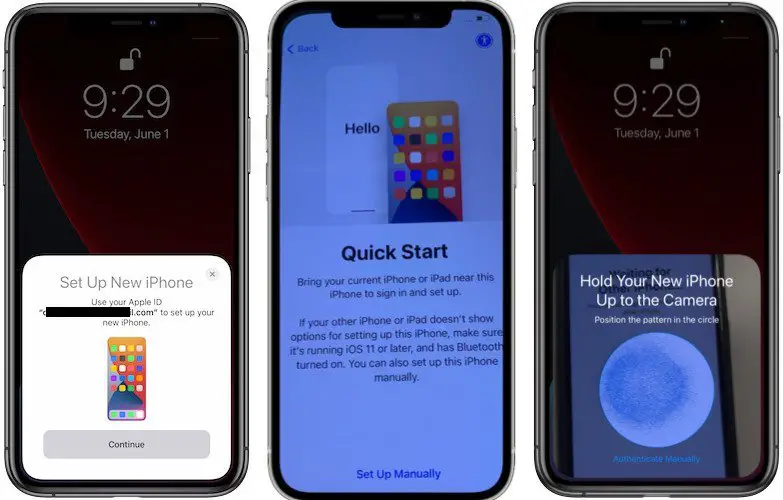 Tip: Sometimes this authentication procedure can be glitchy and you can bypass it by choosing Authenticate Manually. In this case a 6-digit authentication code is displayed on your new iPhone and you have to type it on the current device. - Finish on New iPhone: From now on you have to continue the setup process on your new device. However, don’t forget to keep both iPhones close to each other until the data transfer finishes.