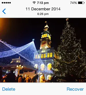 Review the full size capture and decide if you wish to save it or delete it forever. The options are displayed at the bottom of the screen. Once you make your selection you will be asked for a final confirmation. Tap Recover Photo to bring it back.