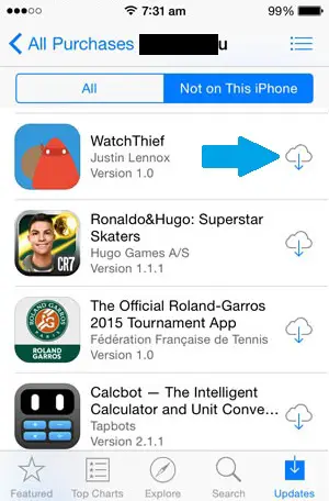 Step 4: Scroll until you find the app you’re missing. Tap on its icon to check it out and make sure that this is the item you where looking for. If you press the cloud icon next to it, the software will be downloaded and re-installed on your iOS device.
