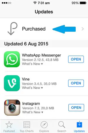 Step 2: Hit Purchased, available at the top of the Updates list. Now, go for My Purchases.