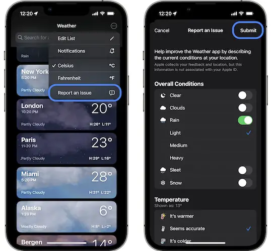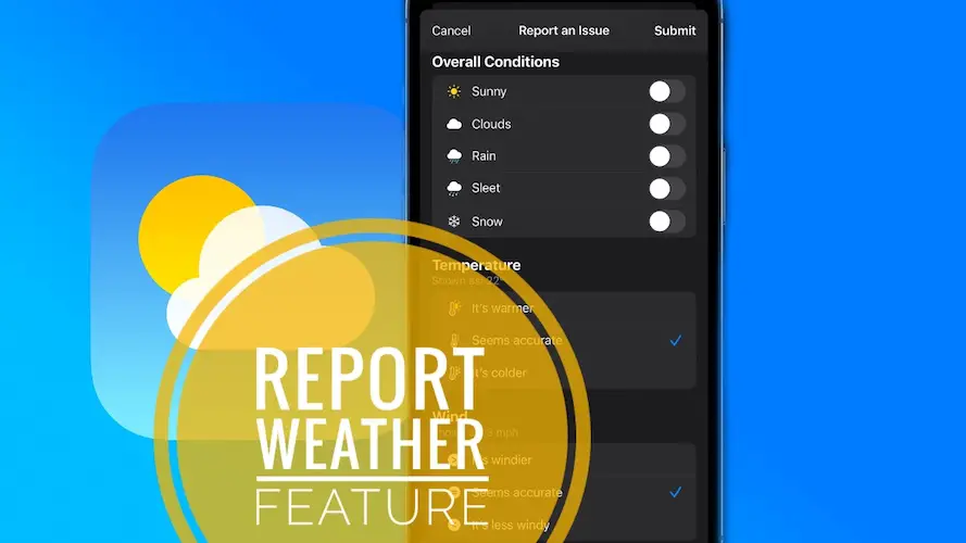 Starting with iOS 15.5 you can report Weather issues on iPhone. Basically, users can submit detailed feedback about the current conditions in your location. You can mention overall conditions, actual temperature, wind status and more.