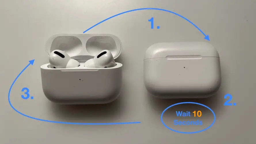 Restarting is simple: Just put the AirPods back in the case and close the lid. Wait at least 10 seconds before you open the lid and get them back out!