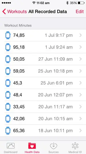 Happily there is a way to review all training sessions tracked and saved on your Apple Watch. For this, you have to open the Health App. Next, select the Health Data tab and pick Fitness. Now, look all the way down and tap on Workouts. Toggle the Show on Dashboard knob if you wish to add the data on the Health app Dashboard. This provides faster access! To review all the saved workouts hit Show All Data and a list with Source, Duration, Date and Time of workout is displayed. Tap on each entry for extended details!