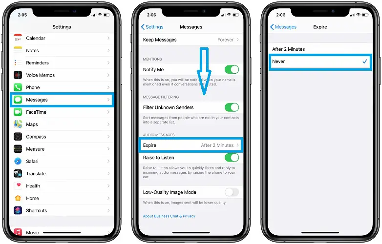 A default iOS option automatically deletes audio messages after 2 minutes. Use the following steps to prevent your recordings from expiring: